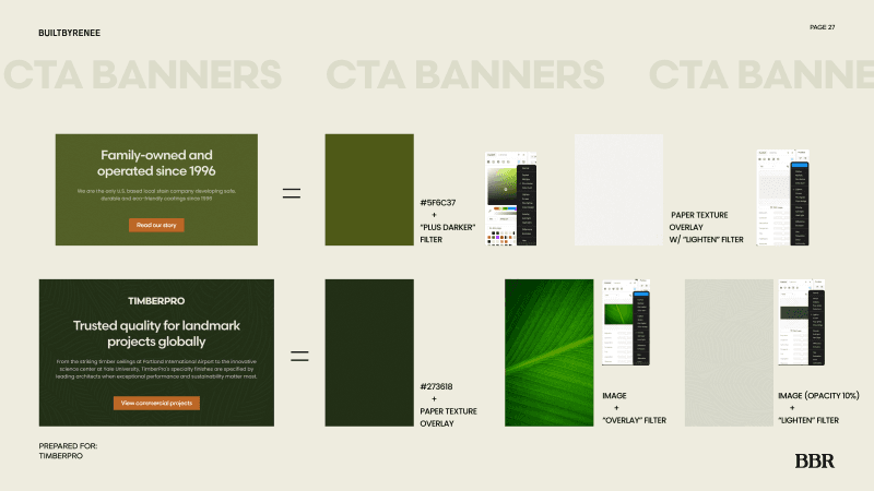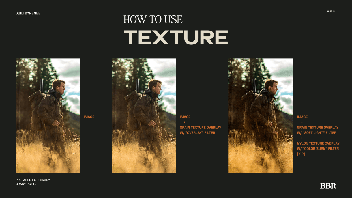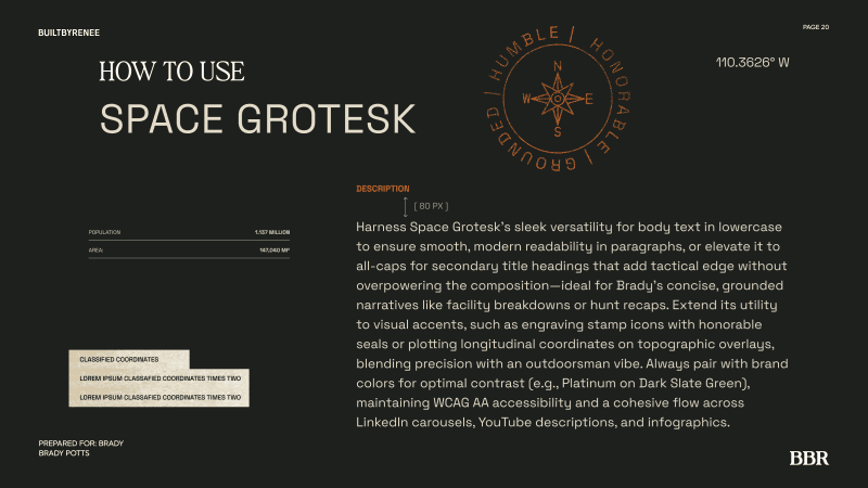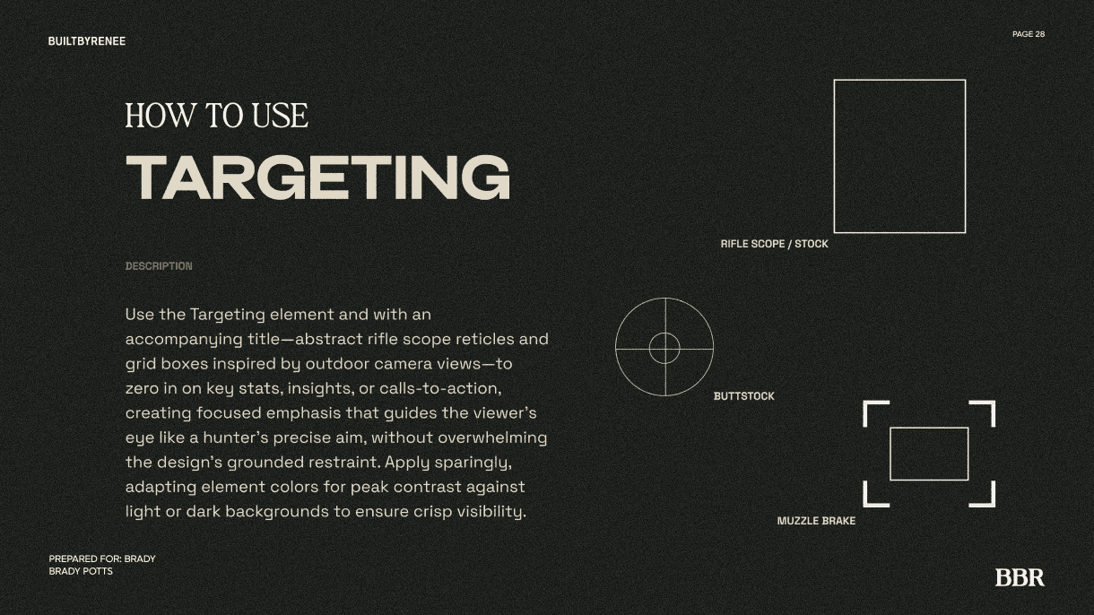 I designed a flexible brand guideline template for BuiltByRenee that has been applied across four distinct clients, enabling consistent brand expression through real-world applications. The system defines clear rules for visual and verbal identity while remaining adaptable to different brand personalities and business needs.