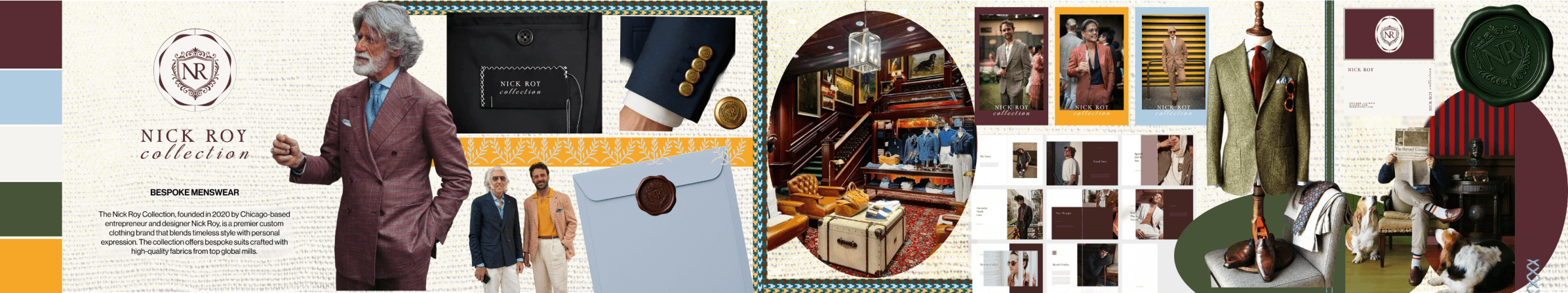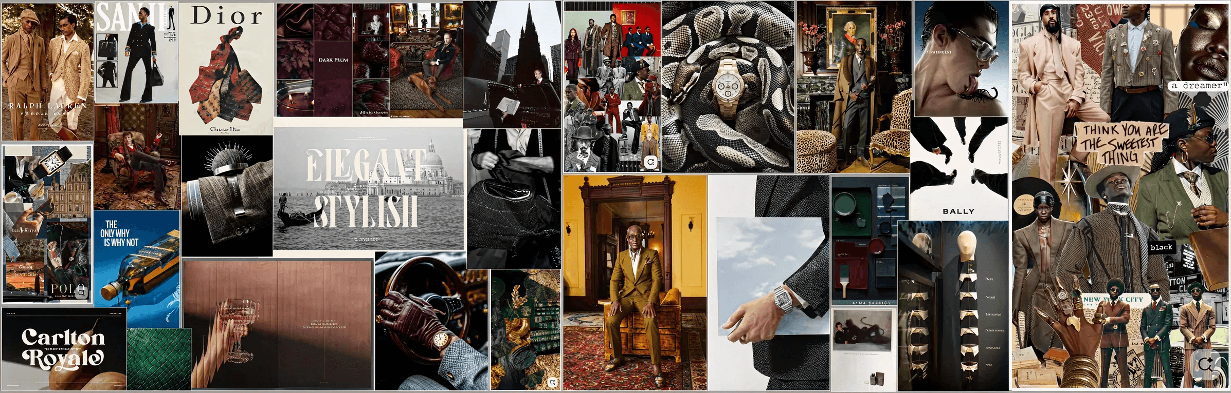 I began with moodboards to explore how luxury, craftsmanship, and subtle boldness could coexist. Drawing from high-end menswear editorials, automotive luxury, architectural materials, and distinctive typography, I tested how far the “sophisticated rebel” personality could be pushed without losing restraint.